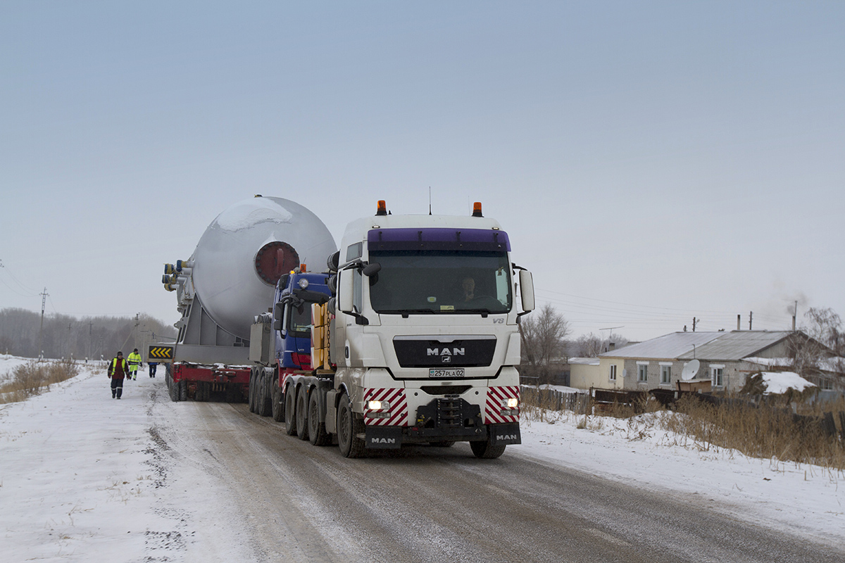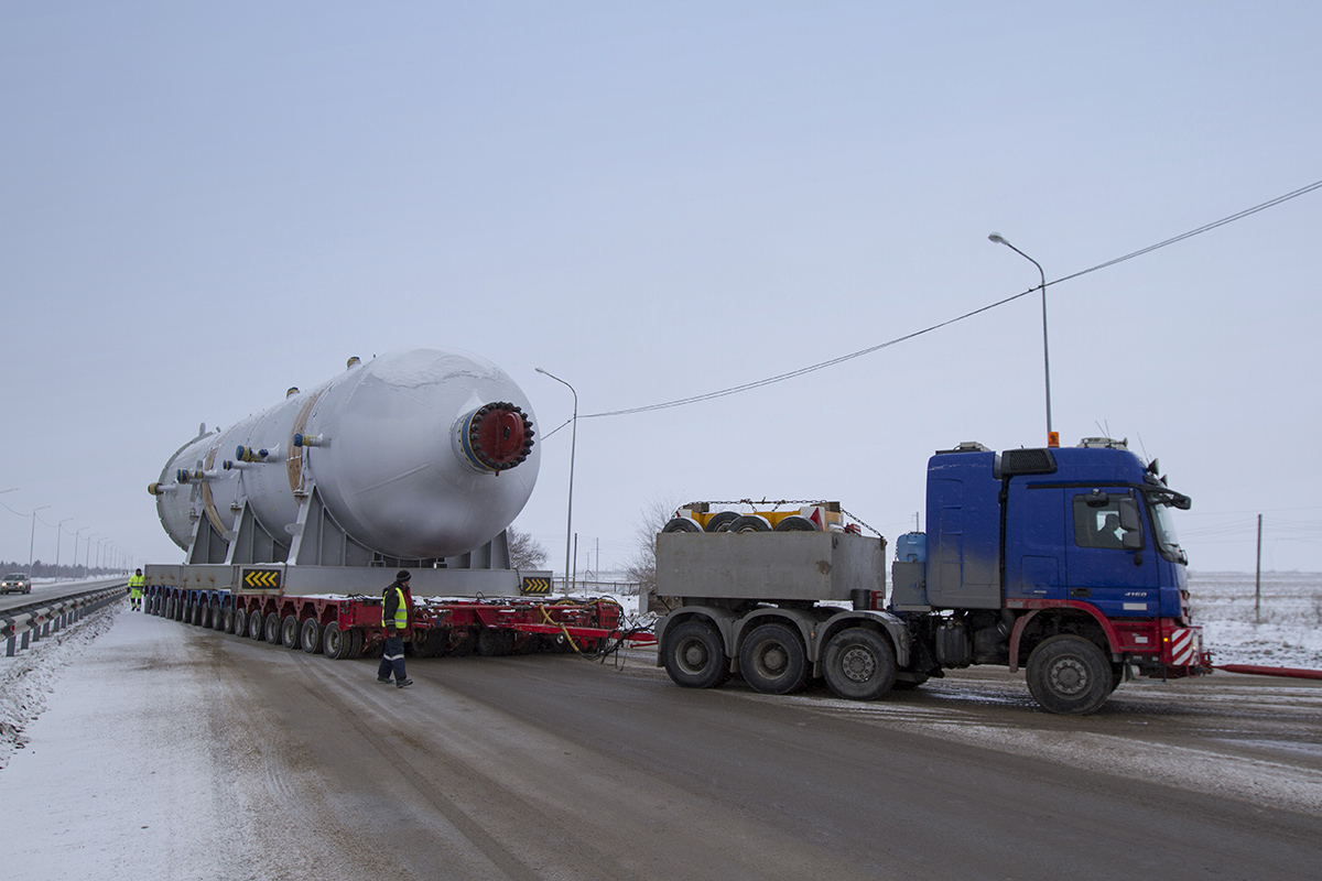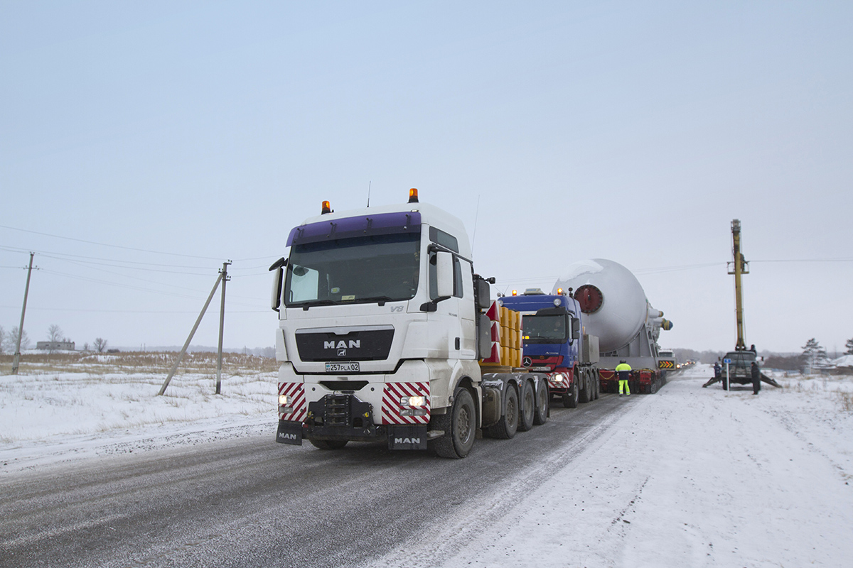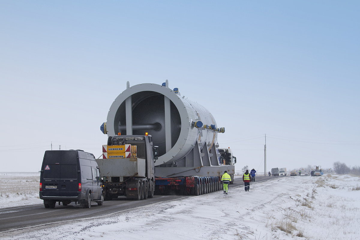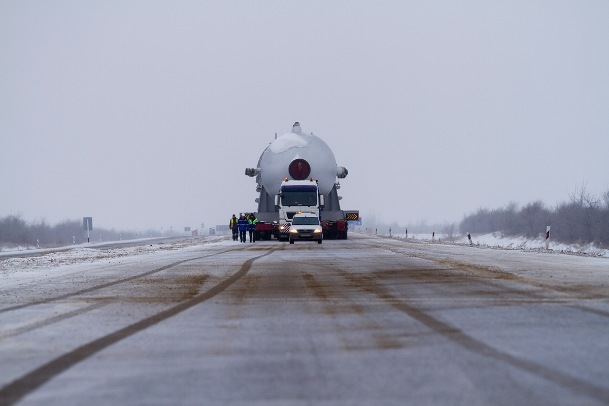 Не взирая на сложные погодные условия, природные особенности и иные внешние составляющие, технологии и точность инженерных расчетов специалистов SWTRANS позволяют сократить расстояния и сэкономить время транспортировки тяжеловесных негабаритных грузов. Транспортировку грузов от причала до территории завода выполняли в два этапа. Первый реактор погруженный на автотранспортную сцепку, состоящую из 16 осей в две линии в сопровождении двух тягачей и машин прикрытия был доставлен от места отстоя до места перекидки (на территории ТОО «ПНХЗ») 2 декабря 2016 г. Средняя скорость движения транспортных средств с крупногабаритным нефтехимическим оборудованием составляла не более 8 км/ч, на время перевозки негабарита по маршруту часть трассы Павлодар – Омск была перекрыта для автотранспорта, грузы сопровождали вышки для отключения линий электропередач. Весь маршрут был согласован с городскими властями и коммунальными службами, получены разрешения на перевозку КТГ. Второй реактор весом 582 тонны перевозили тем же путем 3 декабря.