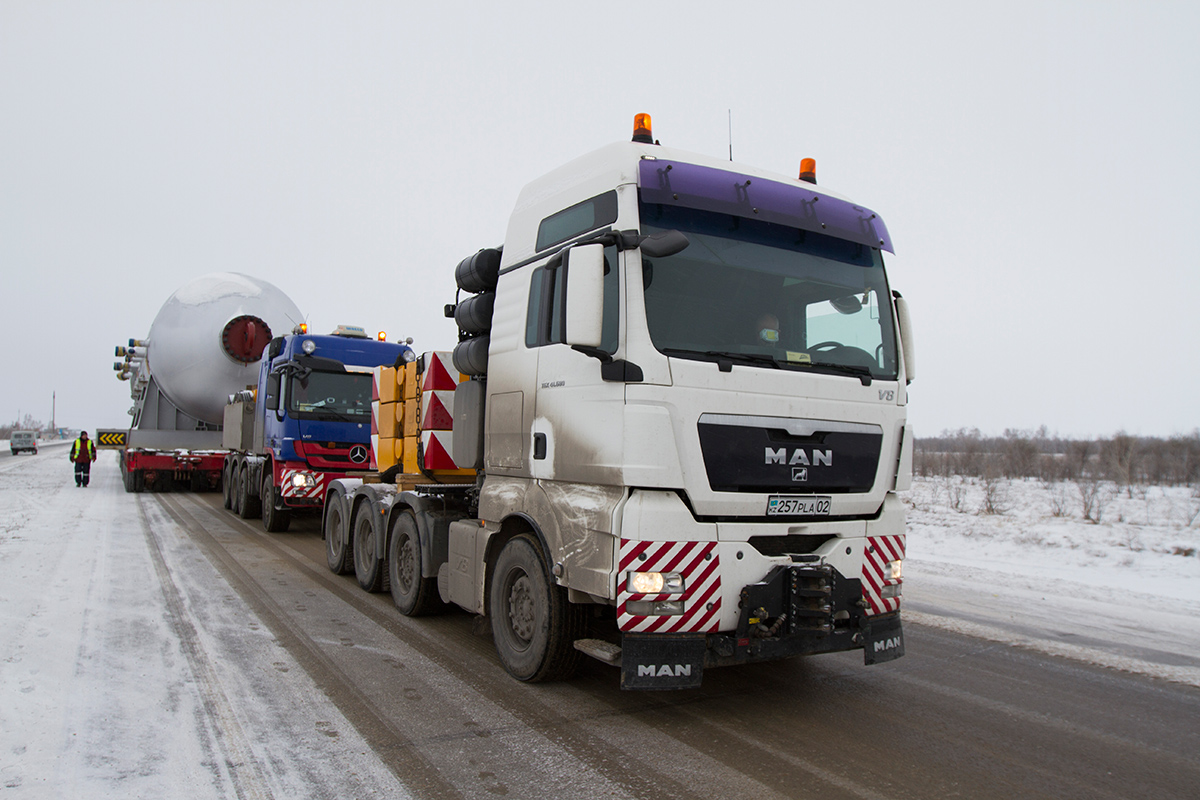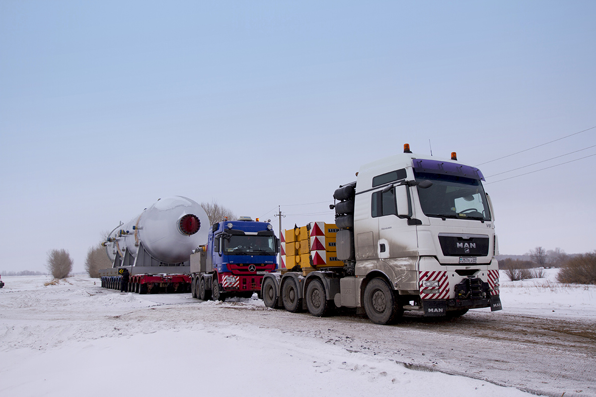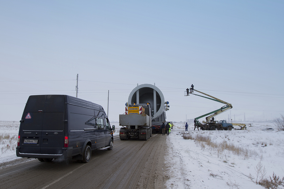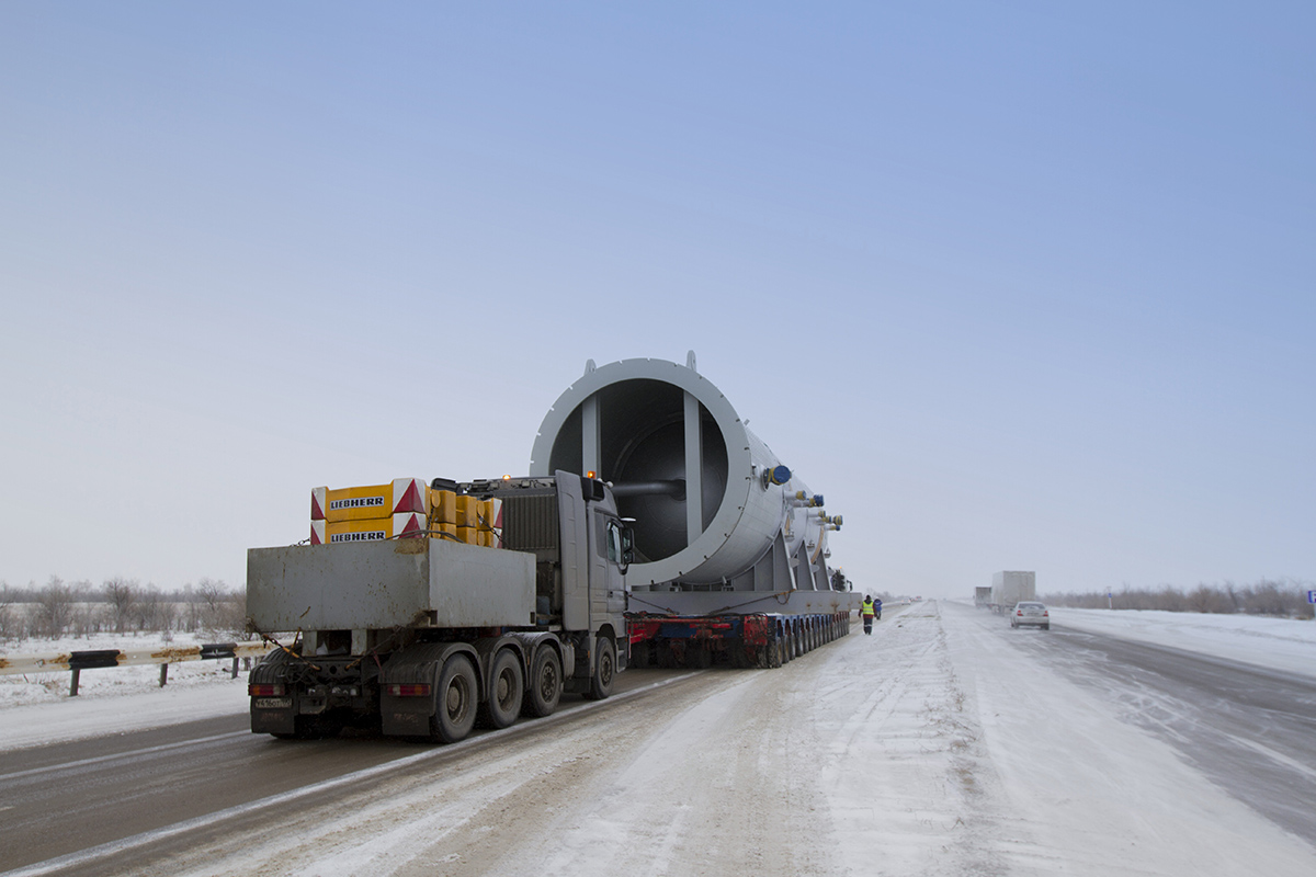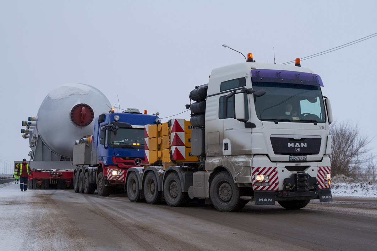 Не взирая на сложные погодные условия, природные особенности и иные внешние составляющие, технологии и точность инженерных расчетов специалистов SWTRANS позволяют сократить расстояния и сэкономить время транспортировки тяжеловесных негабаритных грузов. Транспортировку грузов от причала до территории завода выполняли в два этапа. Первый реактор погруженный на автотранспортную сцепку, состоящую из 16 осей в две линии в сопровождении двух тягачей и машин прикрытия был доставлен от места отстоя до места перекидки (на территории ТОО «ПНХЗ») 2 декабря 2016 г. Средняя скорость движения транспортных средств с крупногабаритным нефтехимическим оборудованием составляла не более 8 км/ч, на время перевозки негабарита по маршруту часть трассы Павлодар – Омск была перекрыта для автотранспорта, грузы сопровождали вышки для отключения линий электропередач. Весь маршрут был согласован с городскими властями и коммунальными службами, получены разрешения на перевозку КТГ. Второй реактор весом 582 тонны перевозили тем же путем 3 декабря.