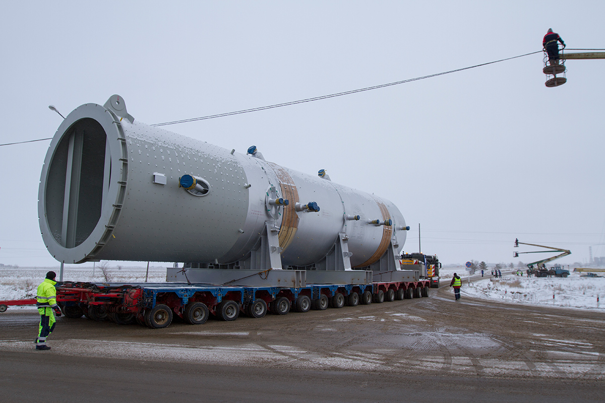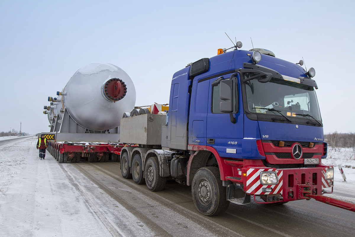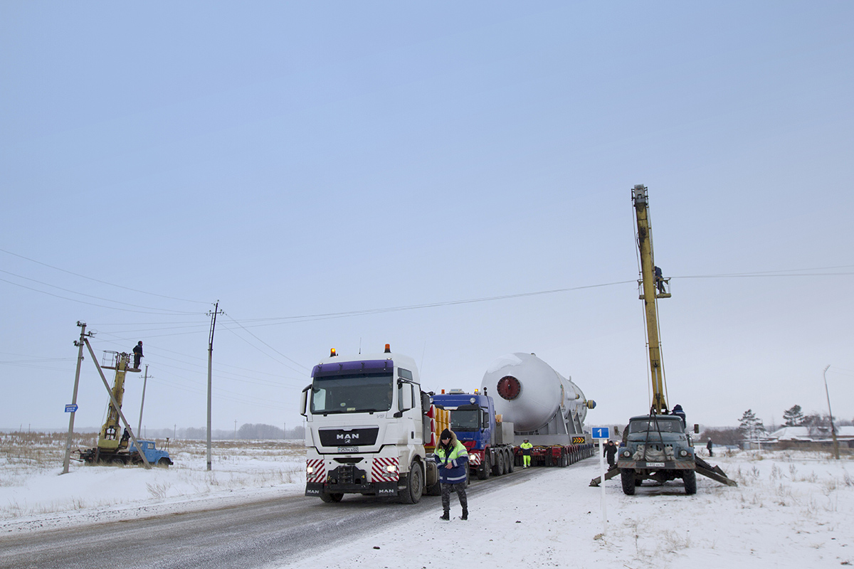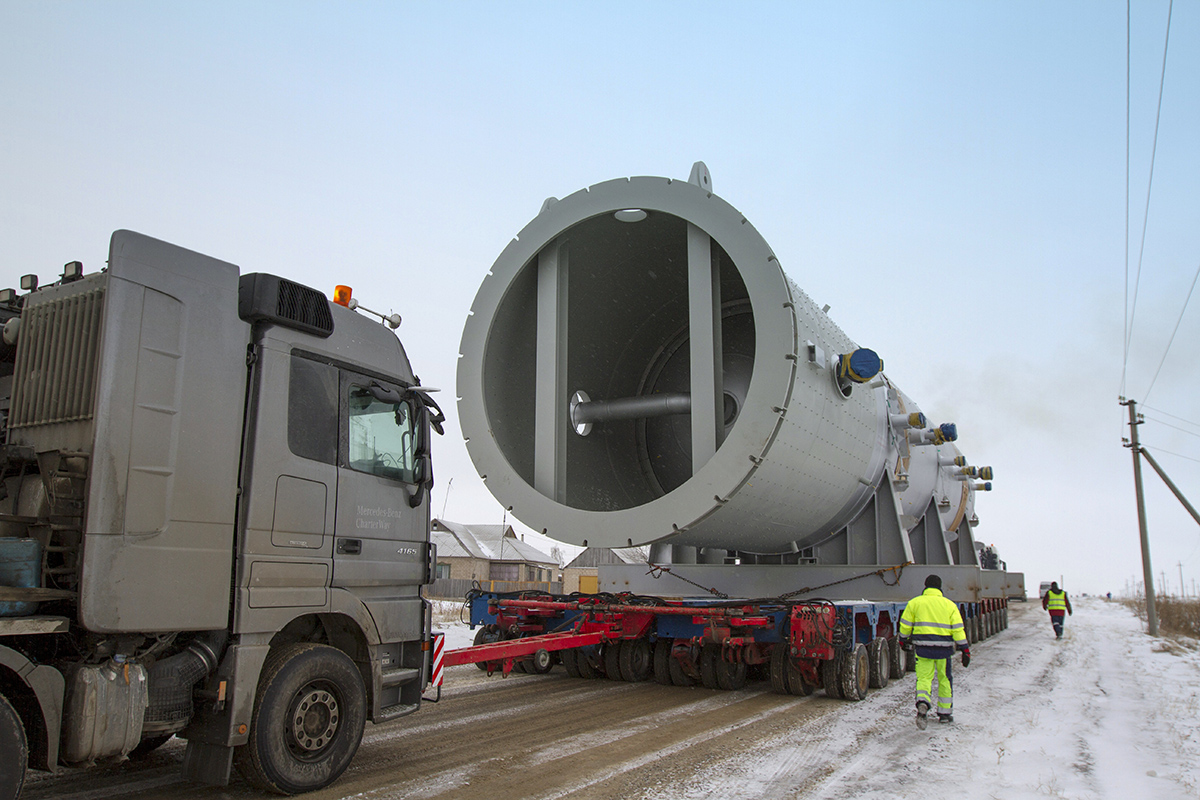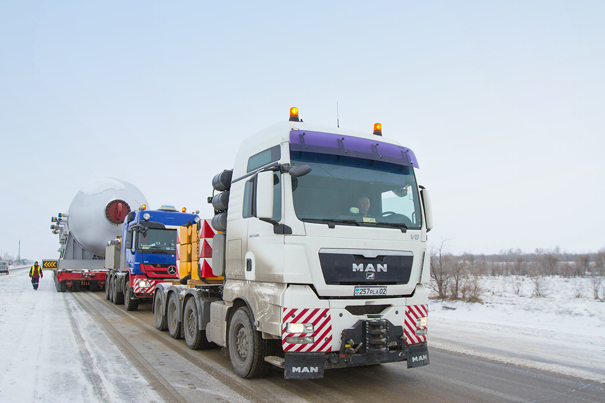 Не взирая на сложные погодные условия, природные особенности и иные внешние составляющие, технологии и точность инженерных расчетов специалистов SWTRANS позволяют сократить расстояния и сэкономить время транспортировки тяжеловесных негабаритных грузов. Транспортировку грузов от причала до территории завода выполняли в два этапа. Первый реактор погруженный на автотранспортную сцепку, состоящую из 16 осей в две линии в сопровождении двух тягачей и машин прикрытия был доставлен от места отстоя до места перекидки (на территории ТОО «ПНХЗ») 2 декабря 2016 г. Средняя скорость движения транспортных средств с крупногабаритным нефтехимическим оборудованием составляла не более 8 км/ч, на время перевозки негабарита по маршруту часть трассы Павлодар – Омск была перекрыта для автотранспорта, грузы сопровождали вышки для отключения линий электропередач. Весь маршрут был согласован с городскими властями и коммунальными службами, получены разрешения на перевозку КТГ. Второй реактор весом 582 тонны перевозили тем же путем 3 декабря.